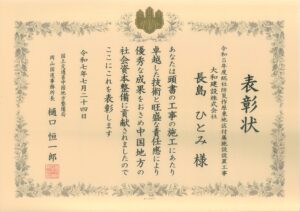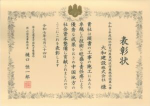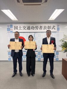 国土交通省 中国地方整備局 岡山国道事務所長から表彰を頂戴いたしました。